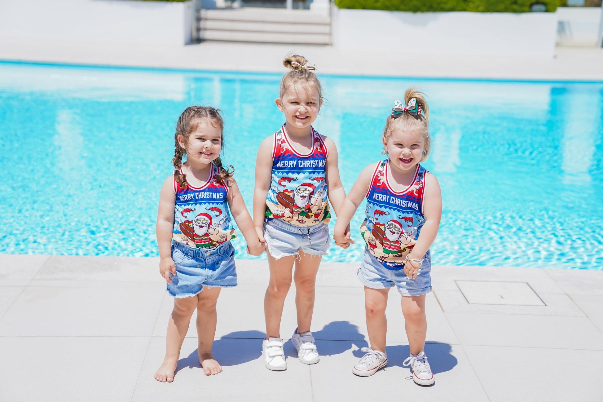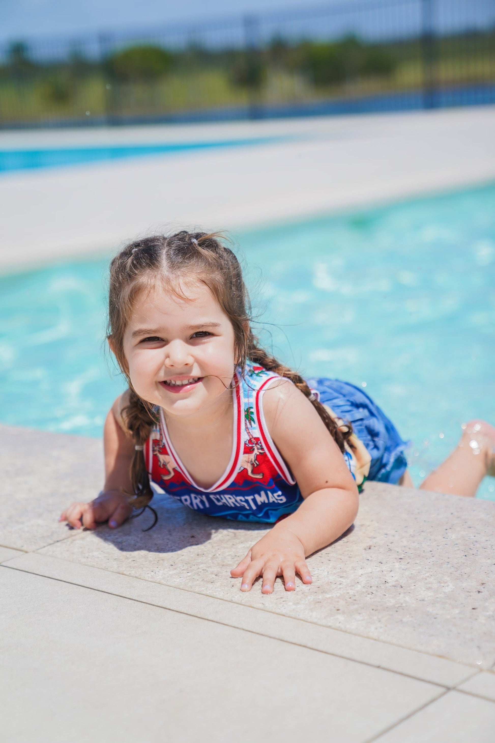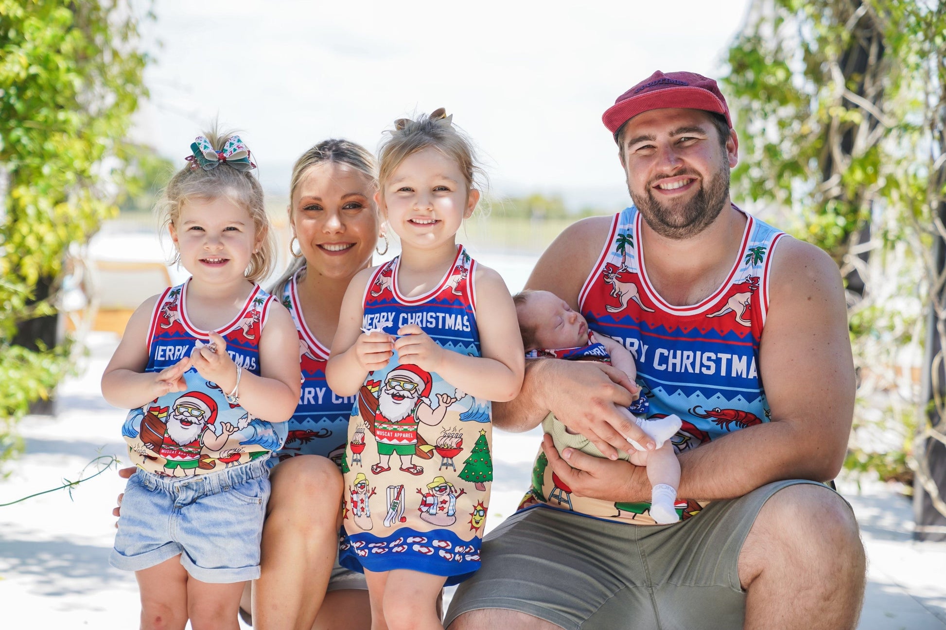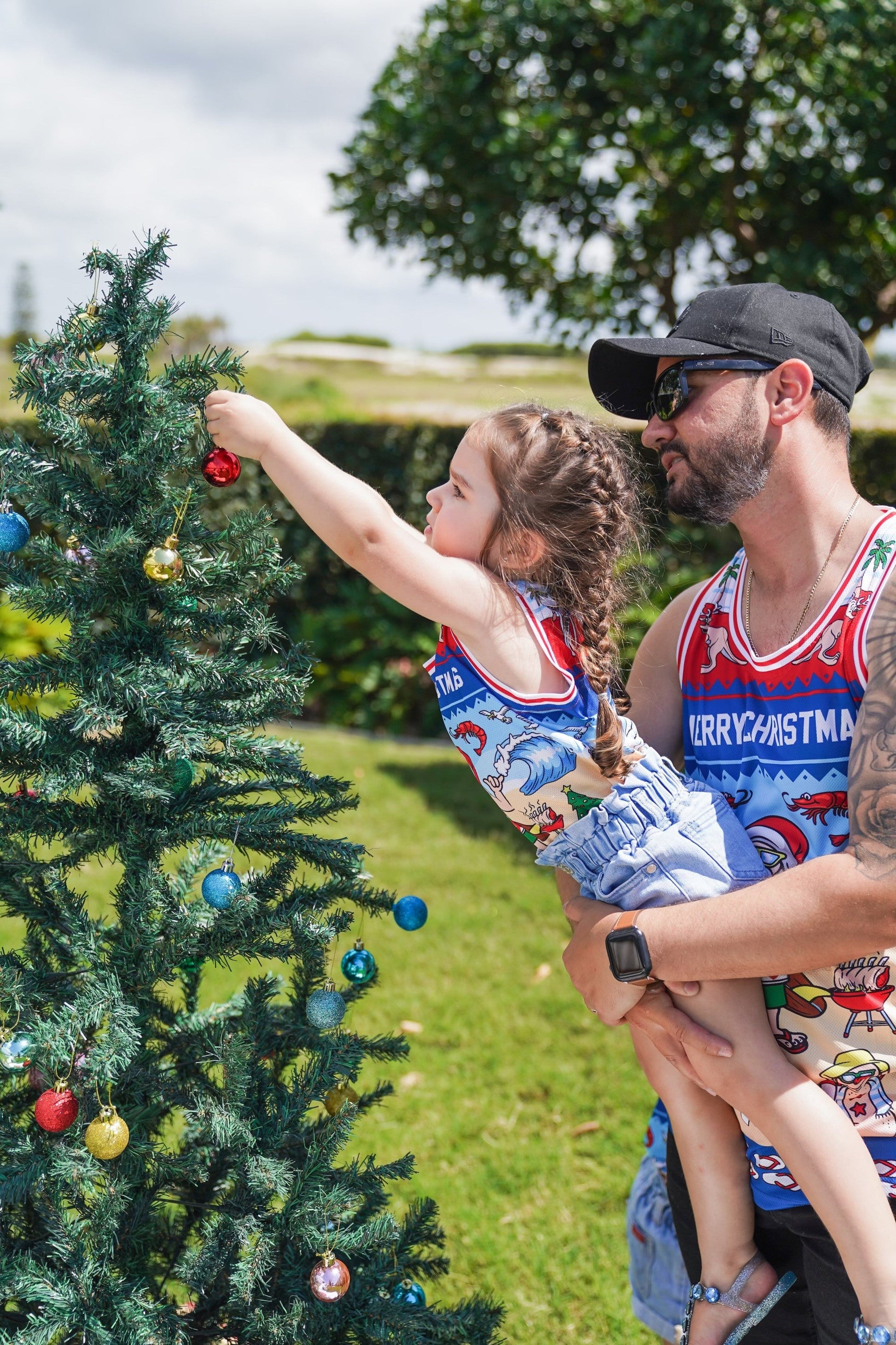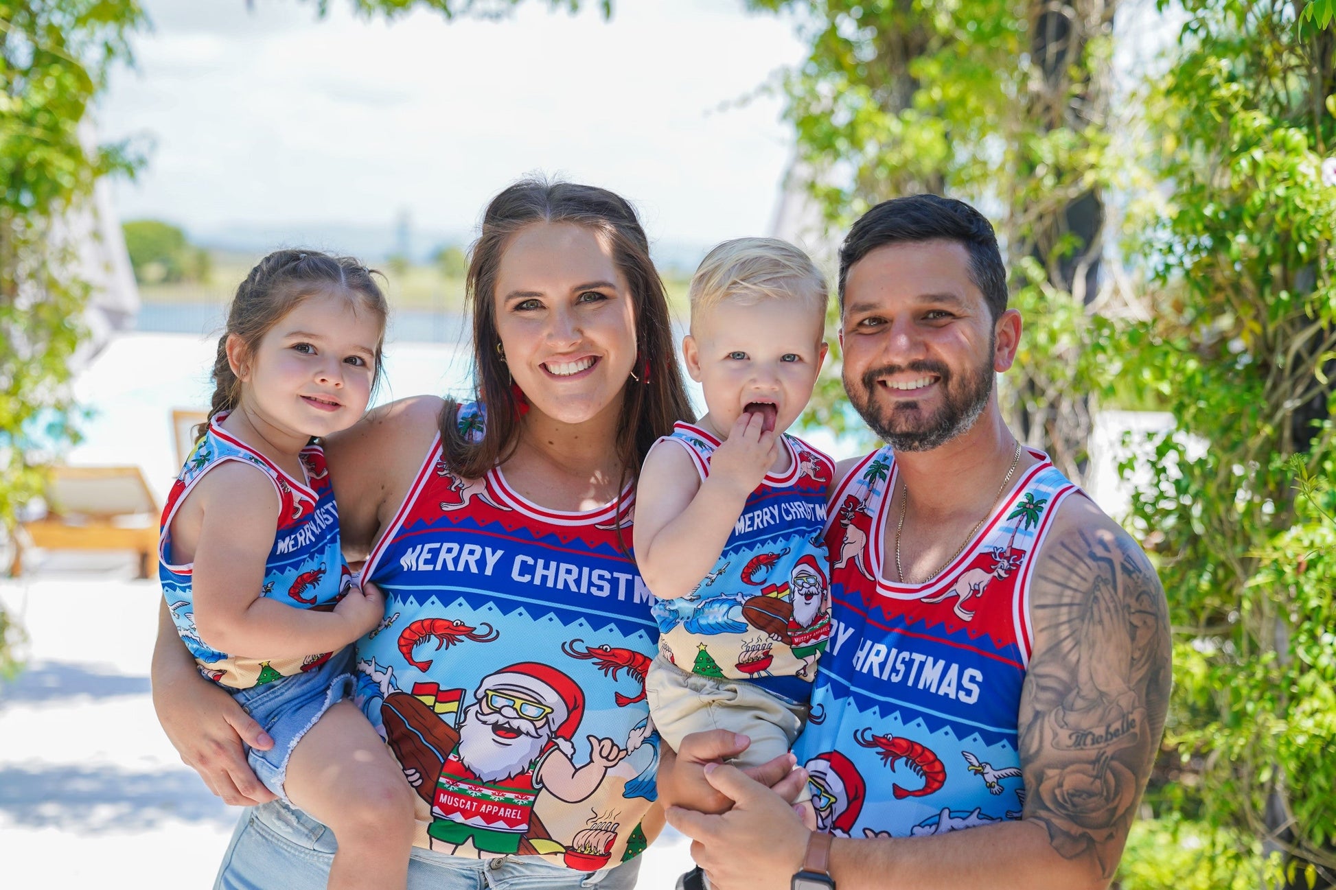 Featuring all of the essentials for an iconic Australian Summer Christmas. Prawns, the beach, rack of lamb on the weber, thongs and a surfing Santa wearing our Festive Ugly Christmas Jersey.