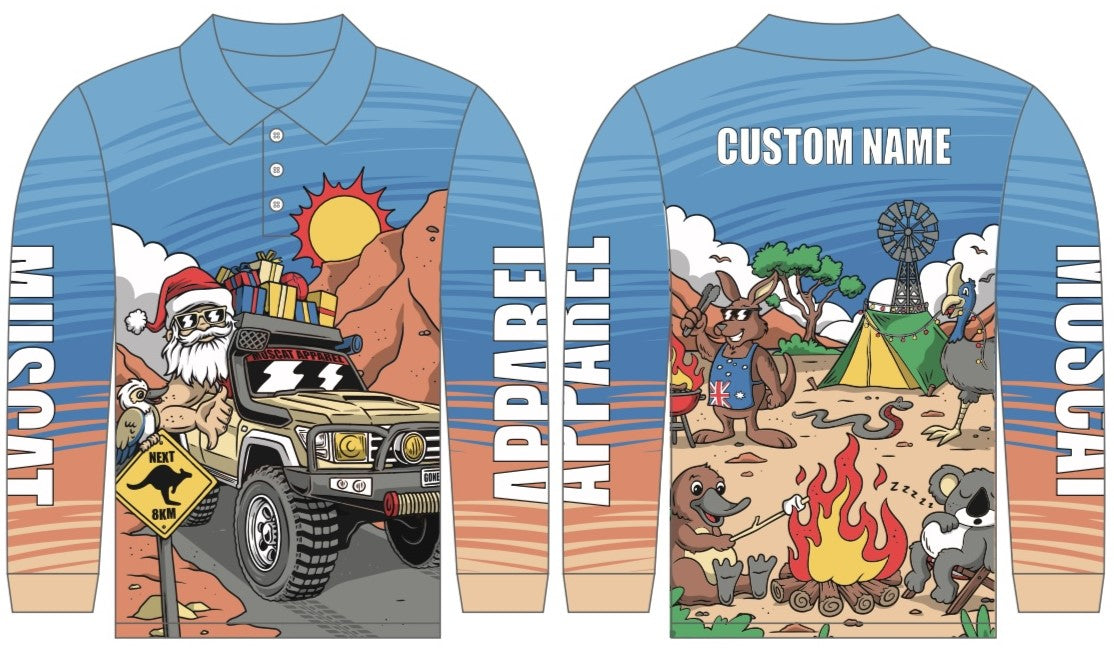 Our Aussie camping shirts are by far one of our most popular designs. An outback camping scene with all of your favourite Aussie animals and Santa in an iconic 4x4. Great for Christmas parties, matchy matchy family Christmas and group trips.