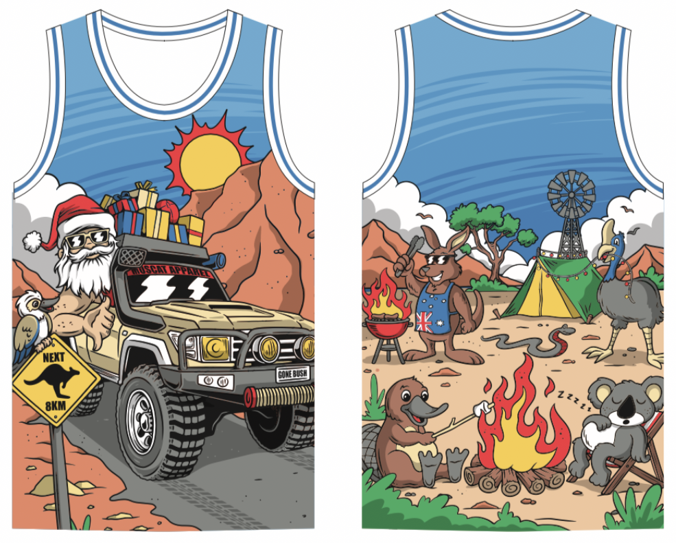 Santa's gone bush! Our Aussie camping shirts are by far one of our most popular designs. An outback camping scene with all of your favourite Aussie animals and Santa in an iconic 4x4. Great for Christmas parties, matchy matchy family Christmas and group trips