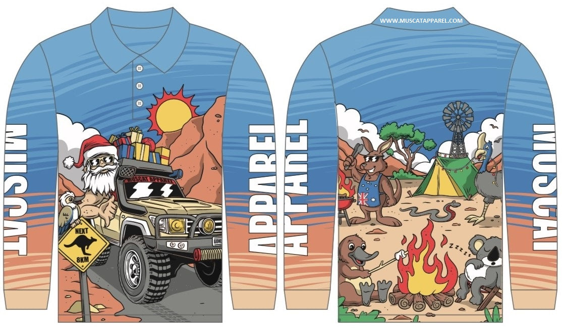 Santa's gone bush! Our Australian camping shirts are by far one of our most popular designs. An outback camping scene with all of your favourite Aussie animals and Santa in an iconic 4x4. Great for matchy matchy families and group trips.