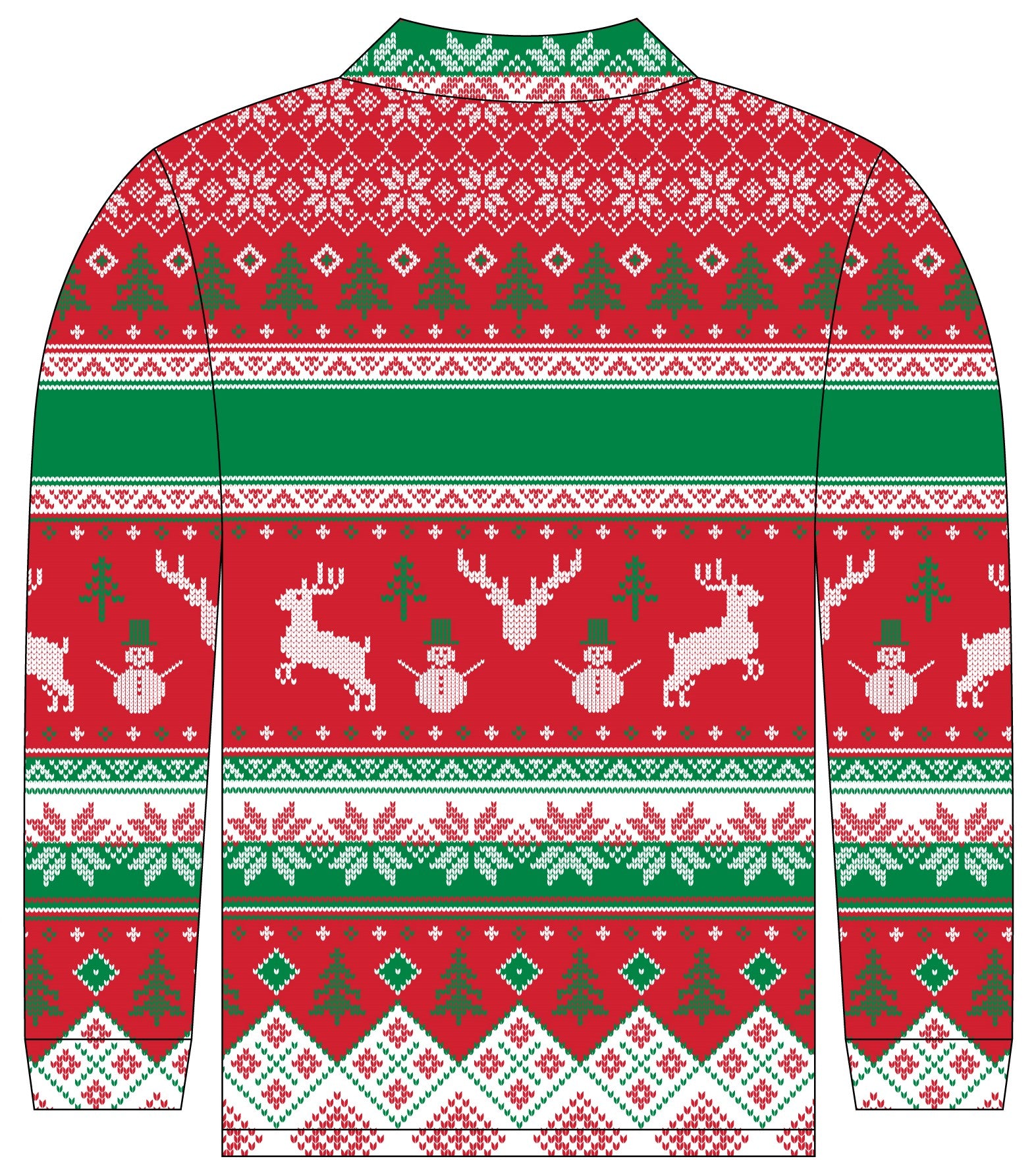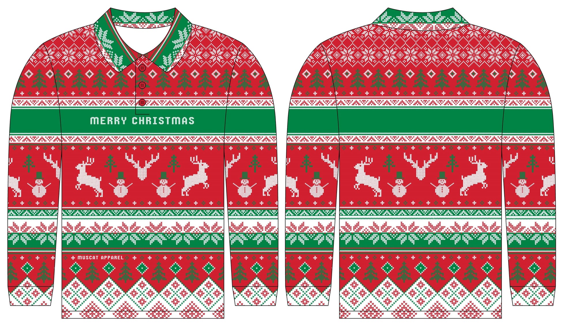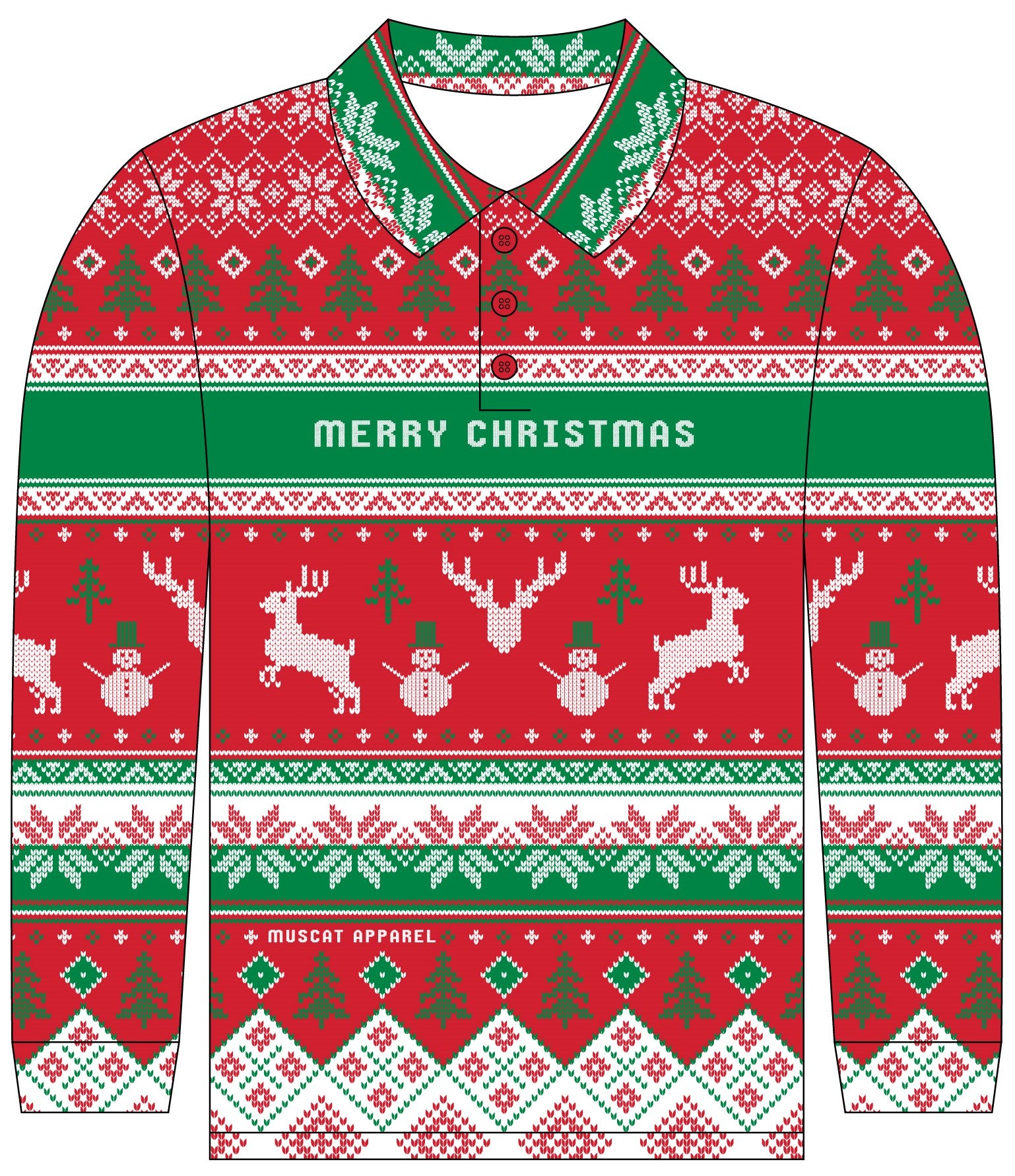 Our OG Traditional FESTIVE green, red and white Ugly Christmas Sweater design. Bold MERRY CHRISTMAS written on the front of the jersey in a knitted font.